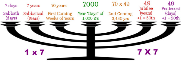 To illustrate this further, let's use the Menorah Lampstand again. The left side is counted in single sevens, and the right side is multiplied again by seven. The seven days of the week end in the 7th day, the Sabbath; likewise the seven years end in a Sabbatical year, the 7th year. Ten times this takes us to the prophecy in Daniel, the "seventy weeks of years", 490 years to the Messiah. On the other side is this system "sevened" - each year. the day after the 49th is celebrated as Pentecost; the year after the 49th year is the Jubilee, and 3430 years is 70 times this. The system will become even more clear when we look at the Jubilee calendar below.
